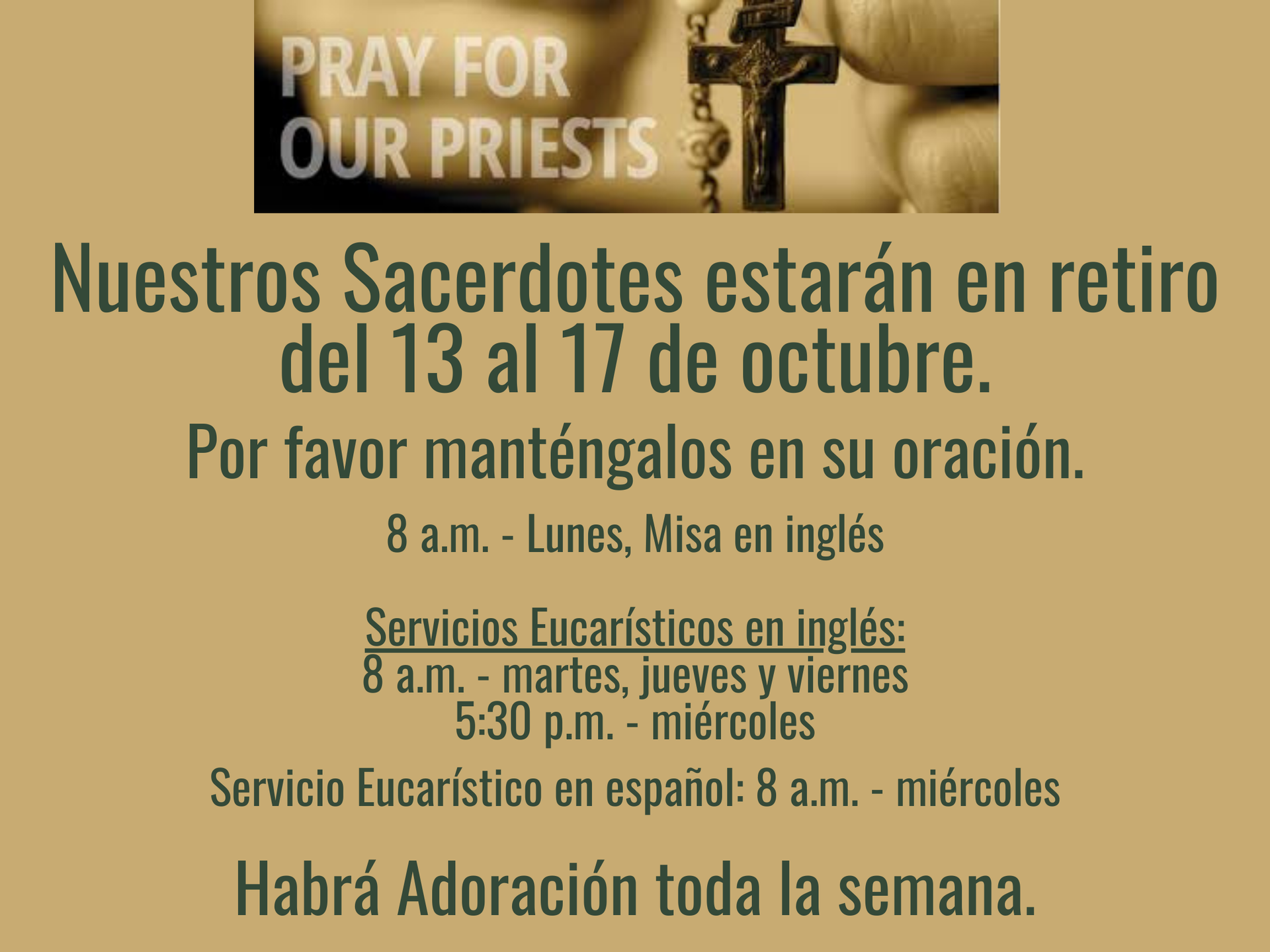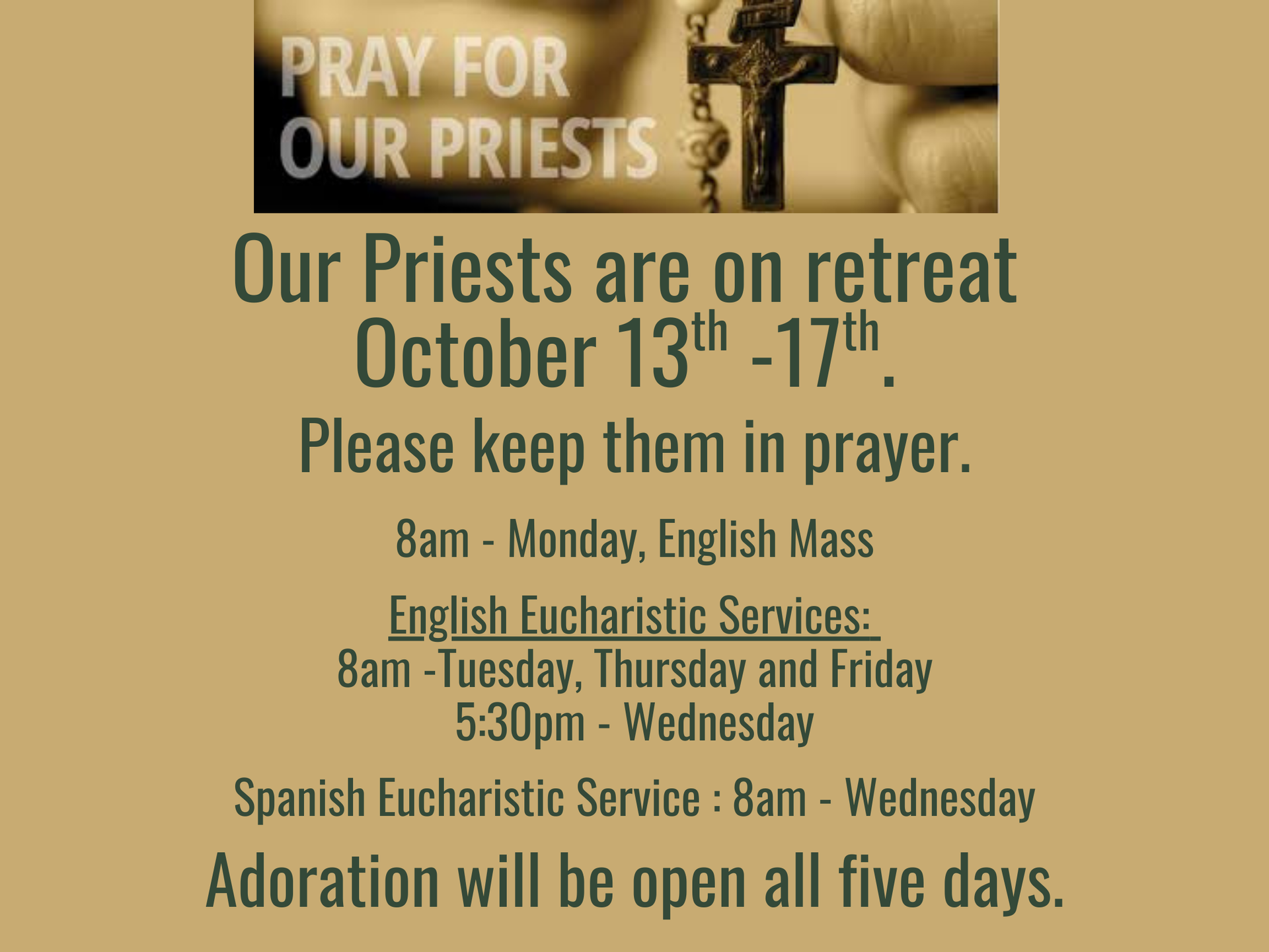 There will not be confessions Oct. 13th-17th while priests are on retreat.