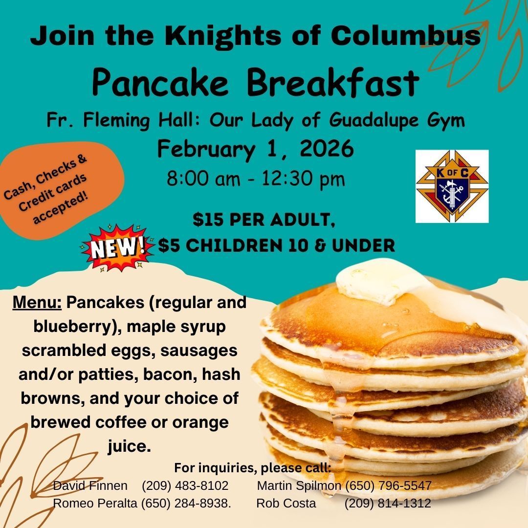 Join the Knights of Columbus on the first Sunday of the month, from 8:00 a.m. to 12:30 p.m. for their Pancake Breakfast.