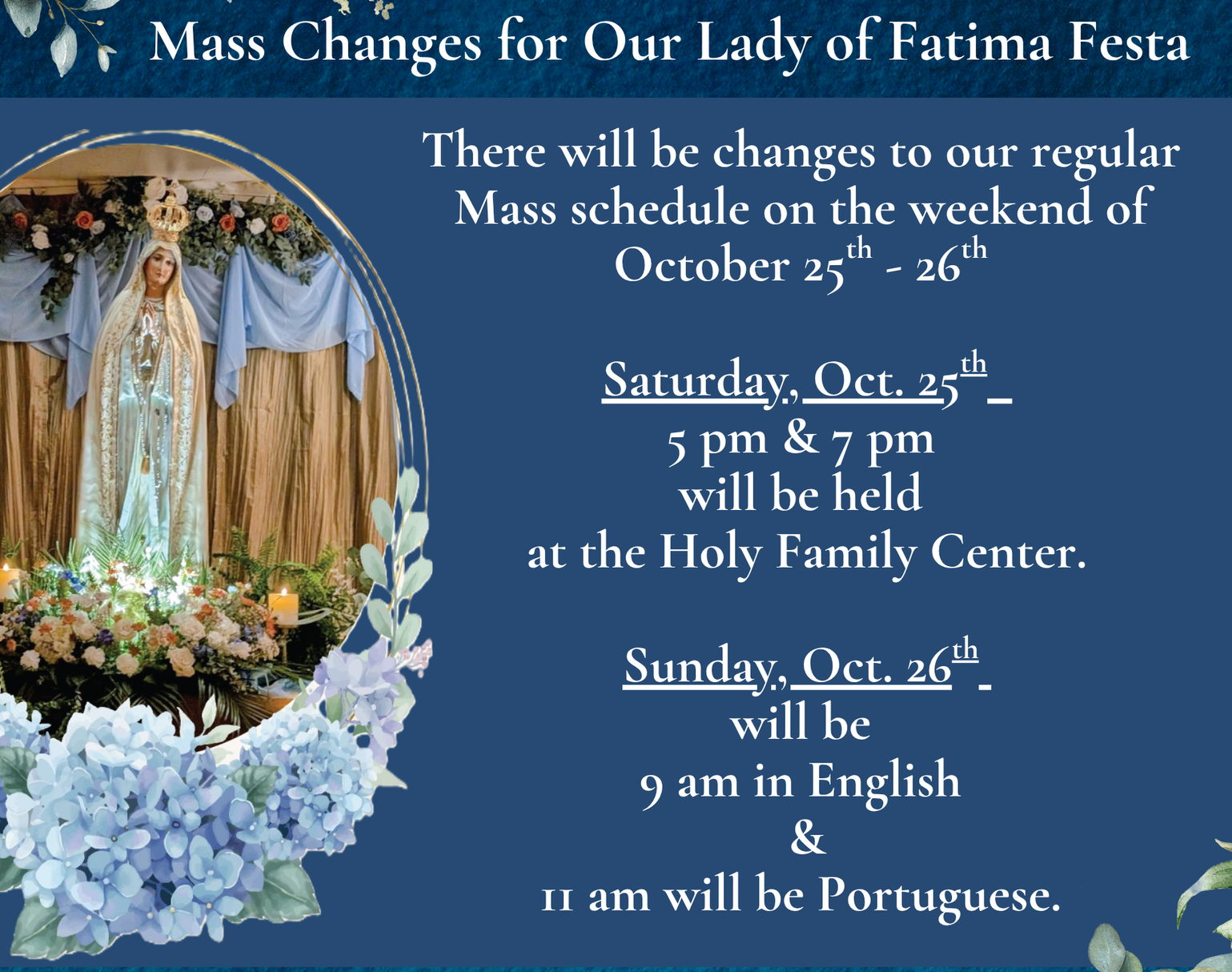 Please check this page for all modifications to the Mass schedule for Holy Days and Major Solemnities.