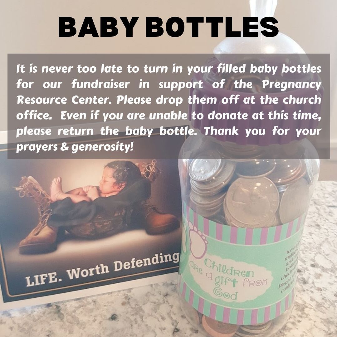 - Baby Bottle Fundraiser-During October’s Respect Life Month, St. Bernard’s organizes a fundraiser for the PRC.